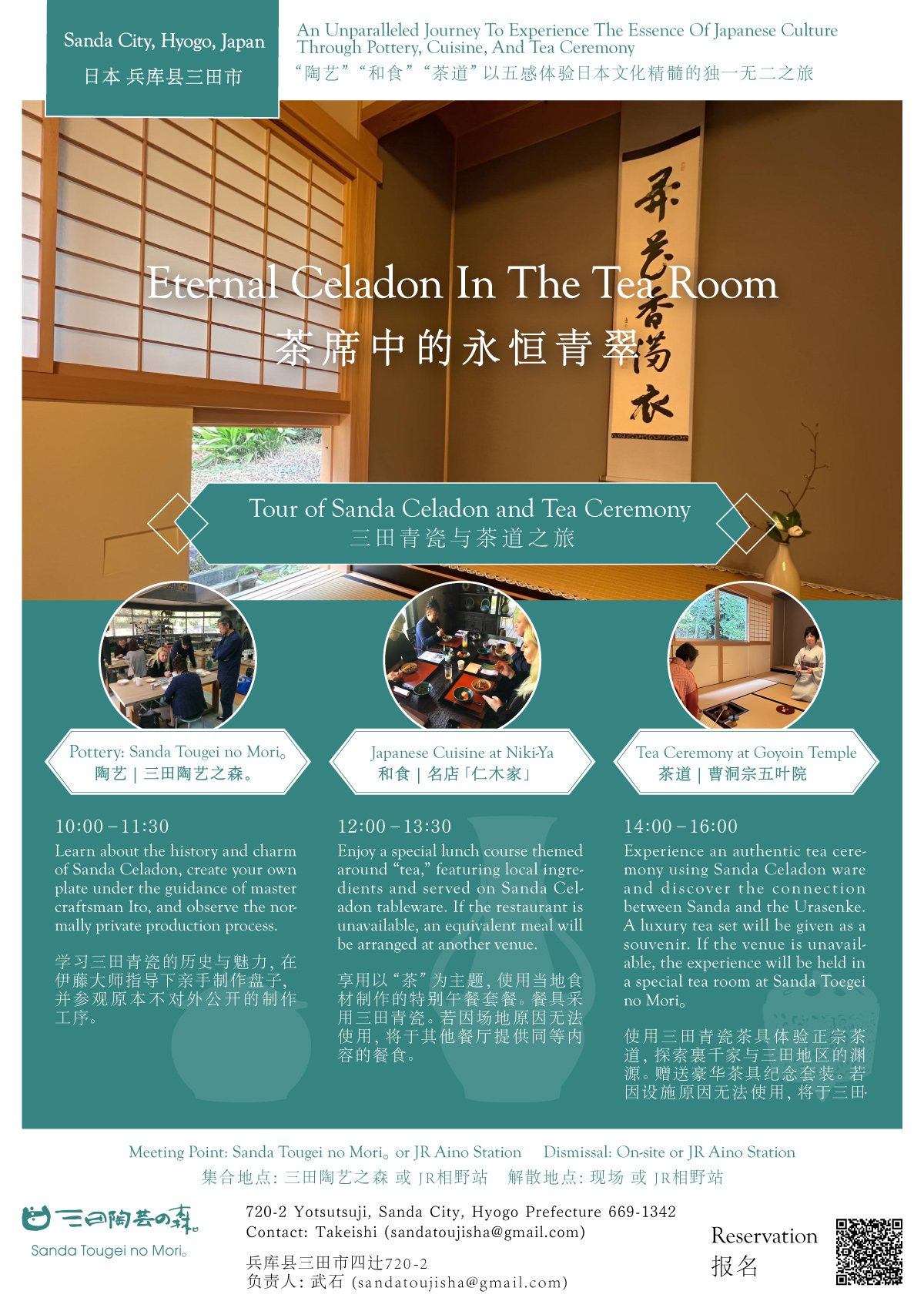 在三田陶艺之森。游客可以接受伊藤瑞宝老师的指导,他是三田青瓷复兴及普及的领先人物。这次与我们交谈关于三田青瓷的伊藤瑞宝老师目前正通过陶艺教室和讲座等的活动推广三田青瓷。不仅在三田,他还希望人们在阪急(神户・梅田)高岛屋等的个人展览认识三田青瓷,并将他的活动扩大到日本各地。他也举办不是以销售为目的的展览会,还积极与三田市共同举行“兵库县立美术馆 原田之森展览”等活动。